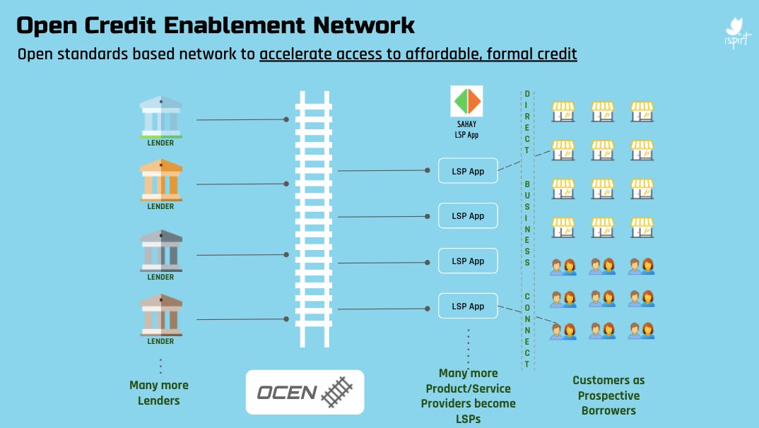 Anyway, as the name suggests, the idea is to create an ‘open network’ to facilitate the flow of credit. At a glance, this network comprises lenders, borrowers, credit bureaus, underwriters, tech companies and - most importantly - a new class of entity called Loan Service Providers or LSPs.