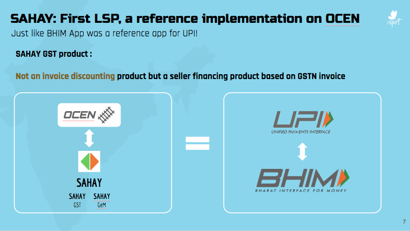 Just like BHIM was the first reference implementation for UPI, the first reference apps for OCEN will be the Sahay GST and Sahay GeM apps. These apps will provide businesses on the GST network and the Government eMarketplace (GeM) with a way to easily apply for credit using their GST invoices and transaction history as data surrogates to obtain loan offers from connected lenders.