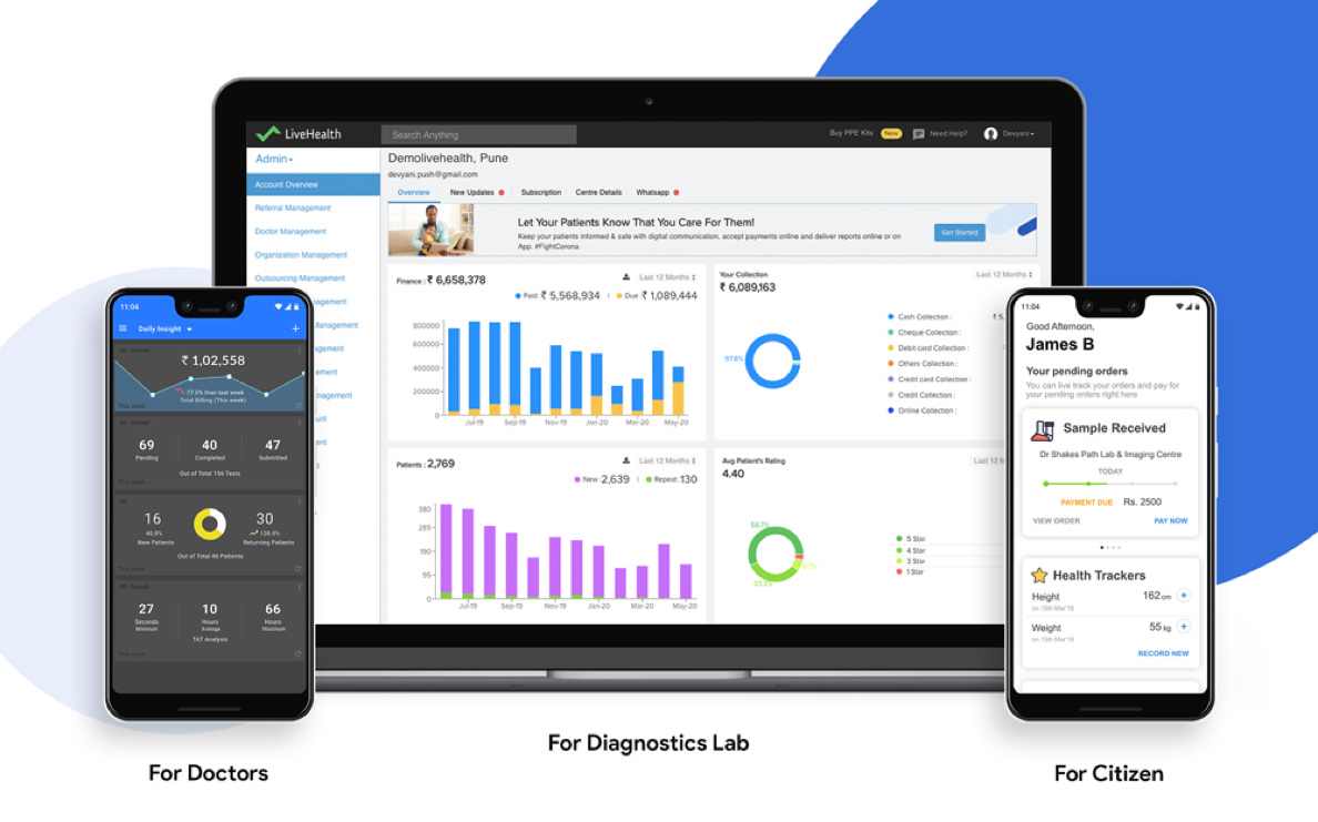 Screenshots of the various LiveHealth user interfaces. The doctor and citizen apps allow those stakeholders to keep track of test results, monitor trends, and book tests. The main attraction, however, is the dashboard for diagnostic labs.