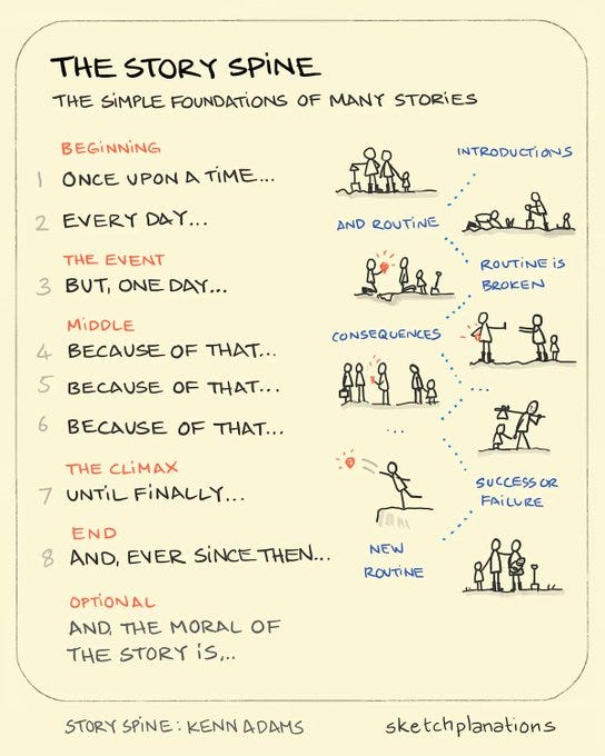 A formula for a great story: Intention + Obstacle. At all moments, the listener should know what the hero wants and what's stopping them from getting there. This one's from Aaron Sorkin, who wrote The Social Network.