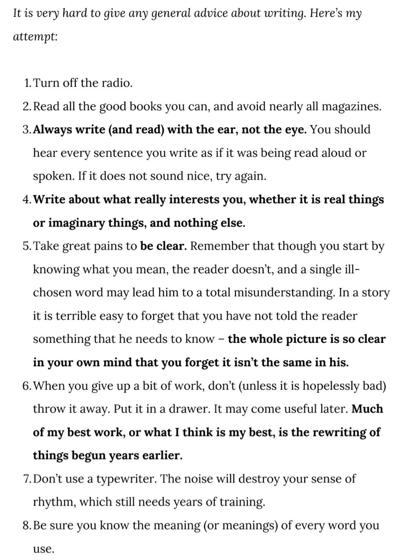 Some of this is from books, tweets, newsletters and podcasts. Some of it Iâve learned by doing. Some of these are just examples of great prose from my favourite authors. Some of this isnât even writing advice - theyâre maxims on company building or creativity that Iâve repurposed to suit my own agenda.