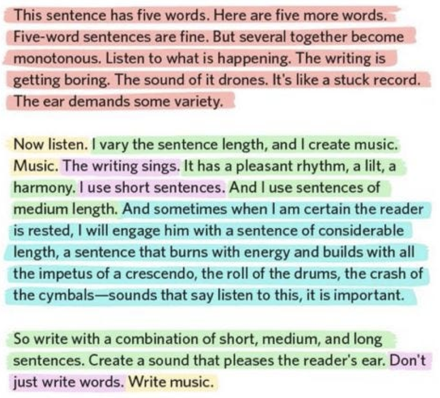 20. The simplest way to improve the rhythm of your writing is to vary the length of your sentences (and the words inside of them). â