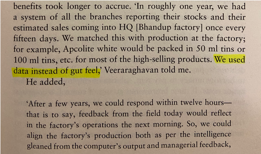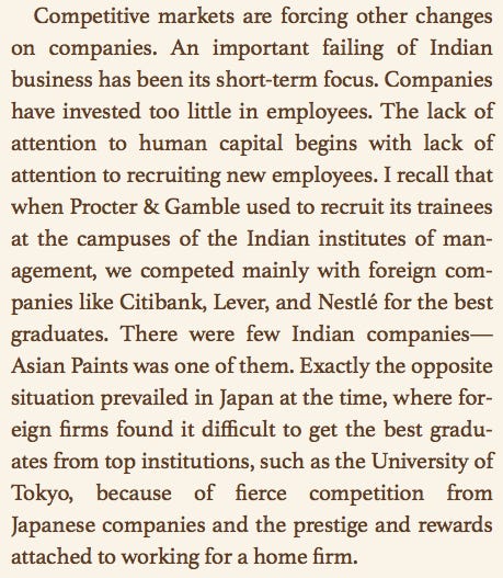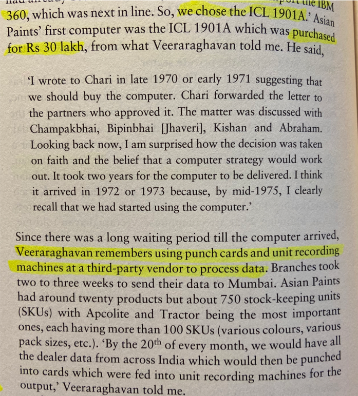 Even this can be contextualised as a symptom, rather than a cause. The cause was Champakbhai having the trust in someone like Bharat Puri to make these kinds of decisions - to choose an agency like Ogilvy, to back an expensive experiment like tinting machines, to retain that trust through mistakes made, to respect the expertise of his manager’s domain. Same with Veeraraghavan and the computer. Same with Nadkarni and the factory. The wherewithal for a family business to trust an ‘outsider’ with the reigns - that’s what made the difference.