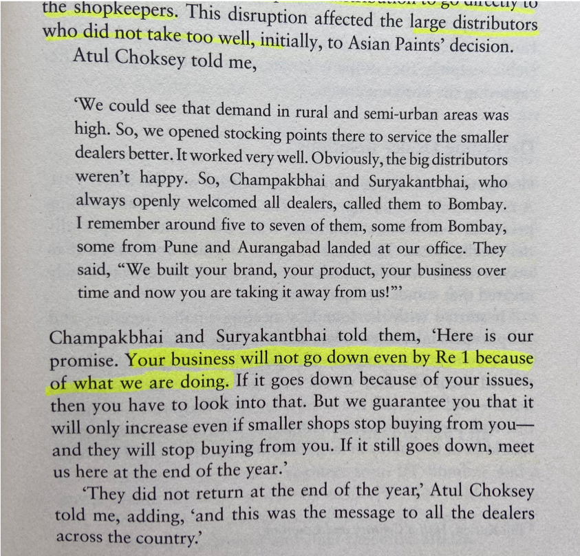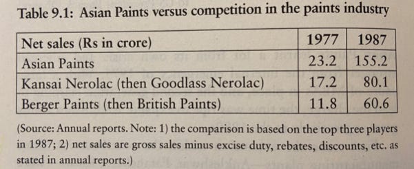 When I look at Champaklal Choksey and the values with which he started his paints business, he was sure (and this has come from all my interviews) that for Asian Paints to survive, the industry must do well. So he never disrupted the industry. He established the best practices for all paints players, and, as history has shown, made several big decisions about the future of the industry that were proven gloriously right. If you’re still at the top after 55 years of huge societal, technological, and economic change - you’ve probably done something right.