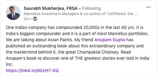 Because a few weeks ago I saw this post from Saurabh Mukherjea (Founder and Chief Investment Officer of Marcellus Investment Advisors), about the launch of Anupam’s new book: