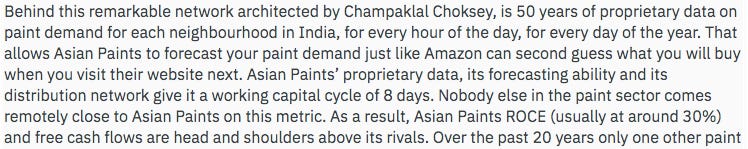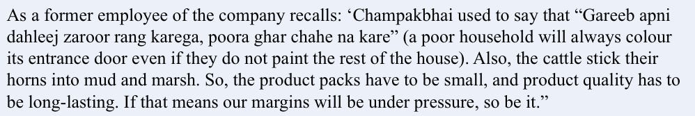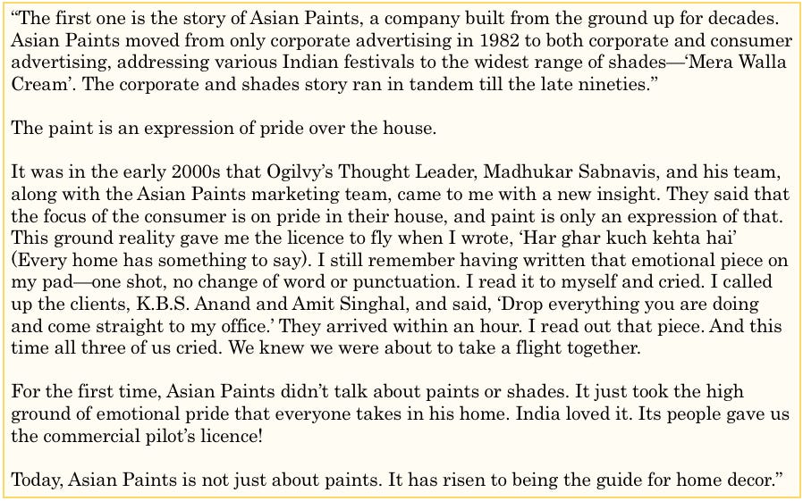 On that note, you devoted an entire chapter to ‘Asian Paints - the consumer brand’. I spend a lot of time thinking about the consumer side of things in India. It’s been a topic we frequently go back to at Tigerfeathers because the products that are popular at any period of time are usually a reflection of Indian society at that time too.