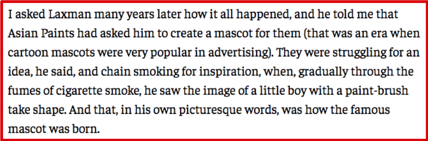 Marshall Mcluhan has this great quote that “The cave art of Madison Avenue has been by far the most innovative and educative art form of the twentieth century.” Given that Asian Paints roped in some of India’s finest creative minds - a legendary cartoonist like R.K. Laxman drew their mascot, A.R. Rahman contributed to one of their ad jingles, Ogilvy’s Piyush Pandey came up with their tagline - they clearly took a very deliberate, artistic approach to their communication. I’m curious what you learnt about Asian Paints’ approach to marketing and advertising that you could share with us.
