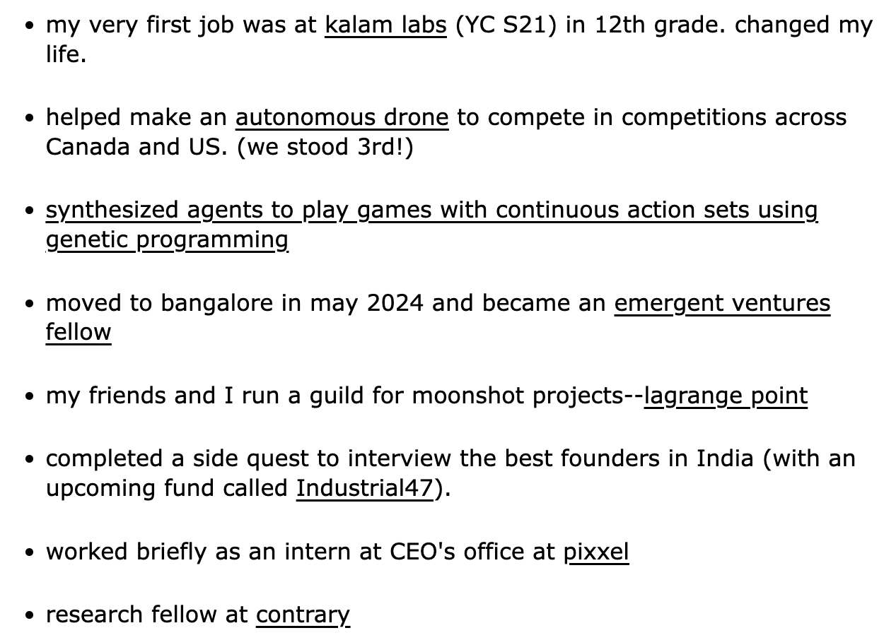 Long story short, I moved to Bangalore in May 2024 after receiving a grant from Emergent Ventures. Side note: A massive shoutout to Shruti and the EV team for taking a leap of faith in me and 100s of other kids with big dreams and small pockets. We wouldn’t be here without you :)